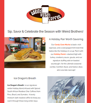 Candy Cane Mocha + Holiday Panini, Ice Dragon’s Breath, local art calls, and holiday catering — it’s all happening at Weird Brothers!